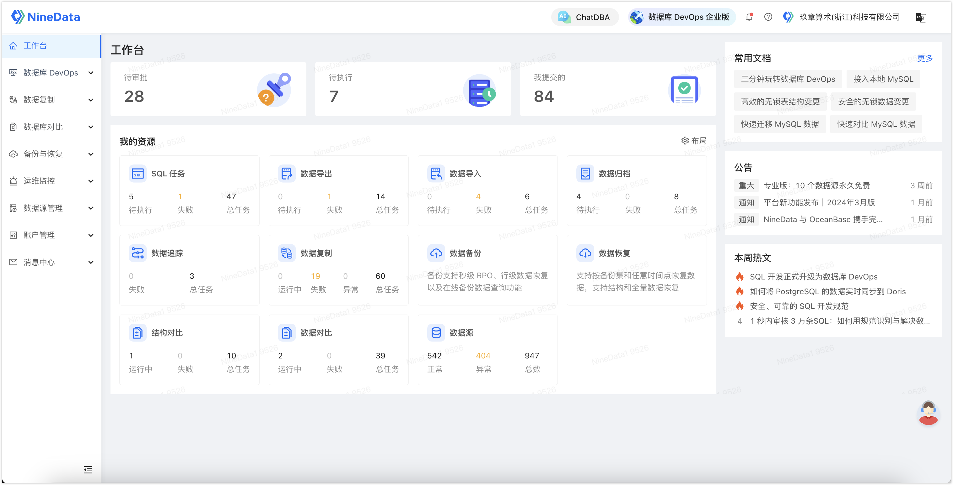 NineData 工作台提供了直观明了的可视化页面,展现了当前账户下所有任务流、资源以及热点信息,包含了任务流总览、资源总览、常用文档、公告、本周热文。