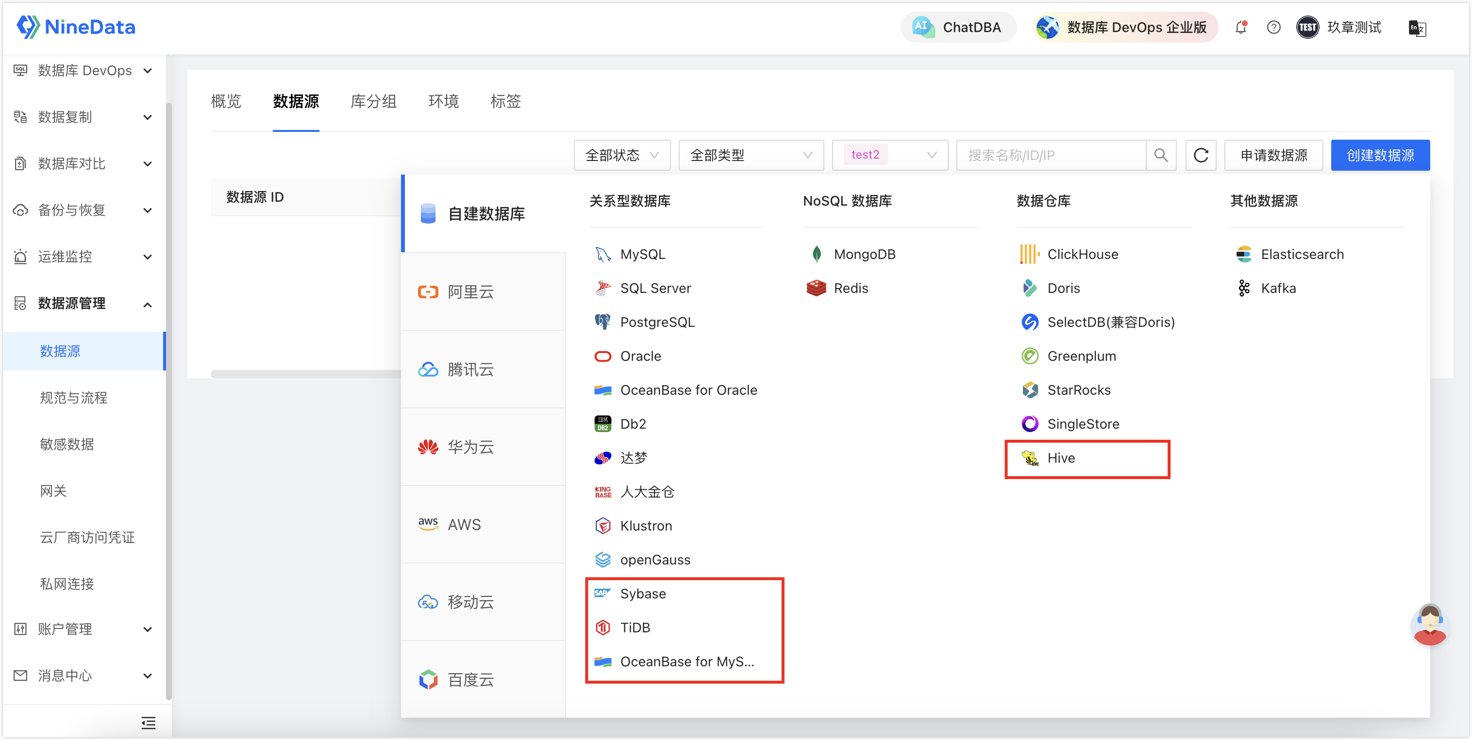 NineData 发布了对 TiDB、Sybase、Hive、OceanBase for MySQL 四种数据源的接入支持,以更好地满足不同用户的需求。