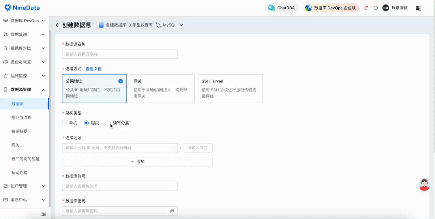 在 NineData 控制台中录入 MySQL 数据源时,在单机架构的基础上,新增支持了容灾、读写分离两种部署架构,支持录入多个节点地址。