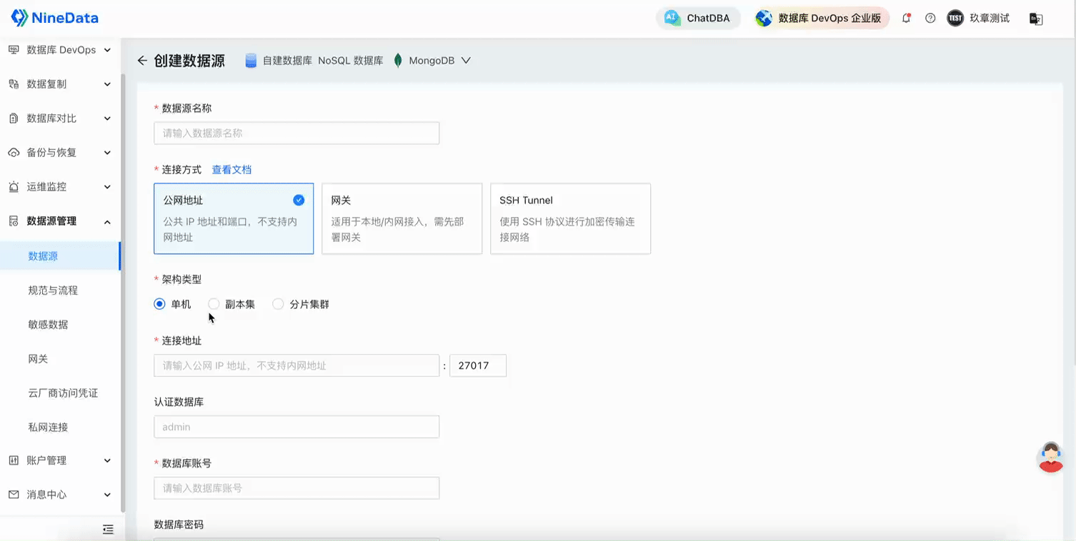 在 NineData 控制台中录入 MongoDB 数据源时,在单机架构的基础上,新增支持了副本集、分片集群两种部署架构,支持录入多个节点地址。