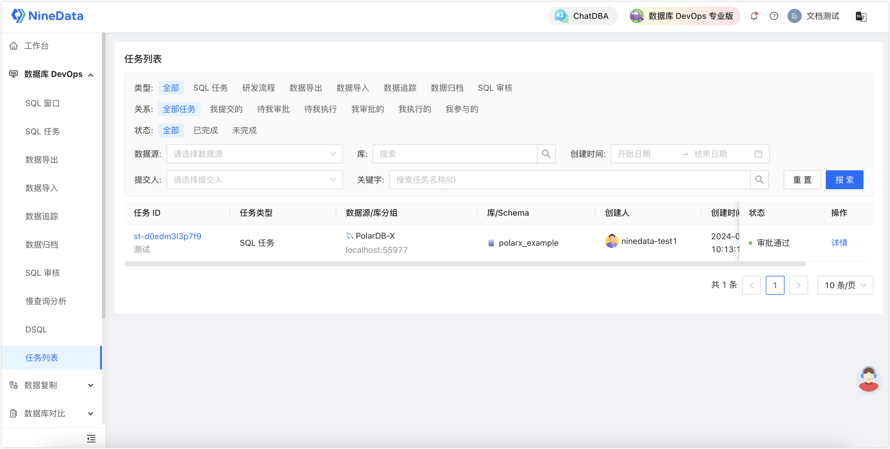 数据库 DevOps 新增任务列表功能,汇总了当前组织中所有和本人相关的数据库 DevOps 任务。您可以根据任务类型、任务关联关系、任务状态进行快速过滤,同时,还支持通过数据源名称、库名称、创建时间、提交人、任务名称或 ID 搜索定位目标任务。