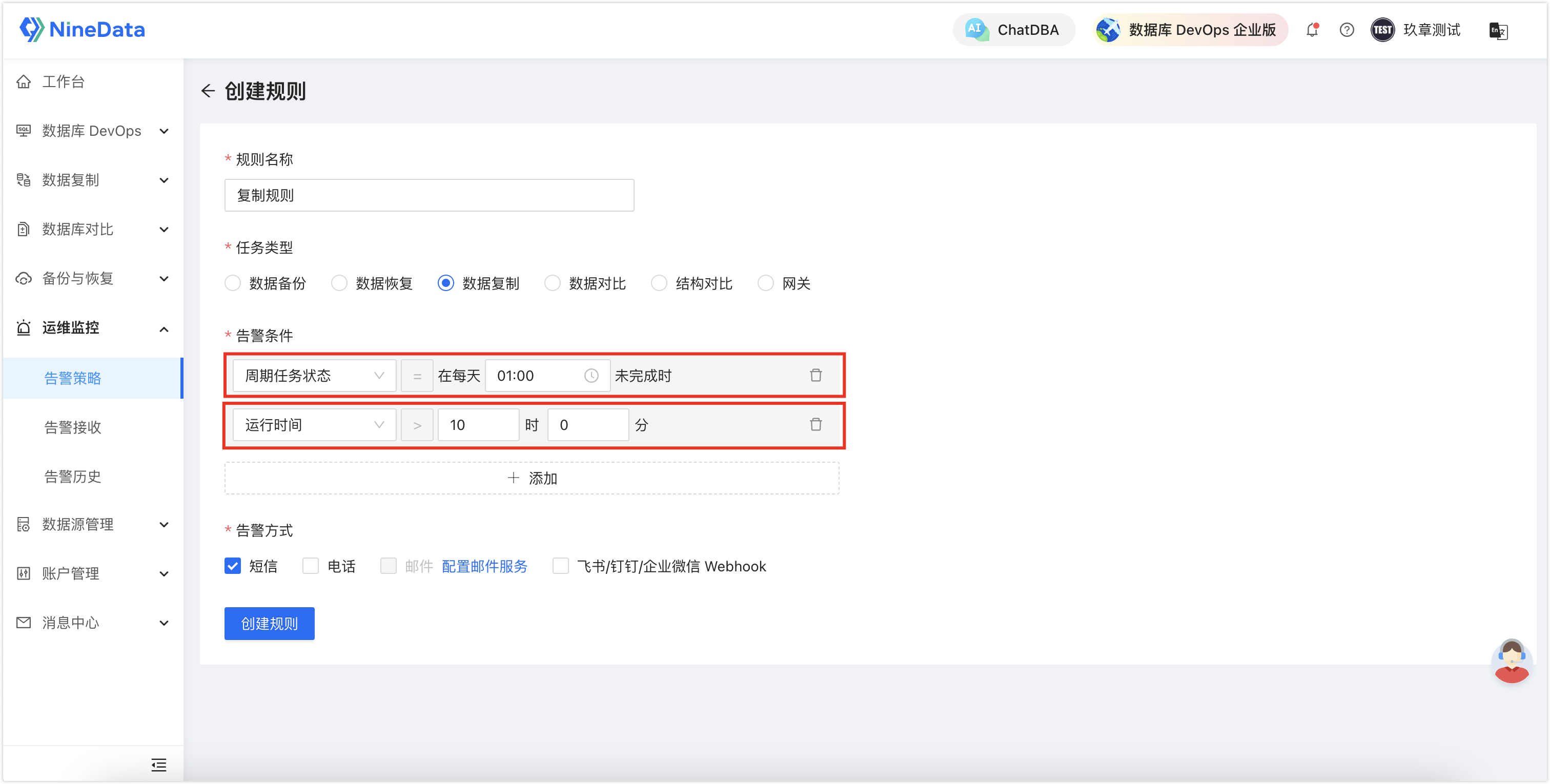 在创建数据复制任务的告警规则时,支持在告警条件中选择周期任务状态和运行时间两个条件,使您可以更加灵活地配置告警。
