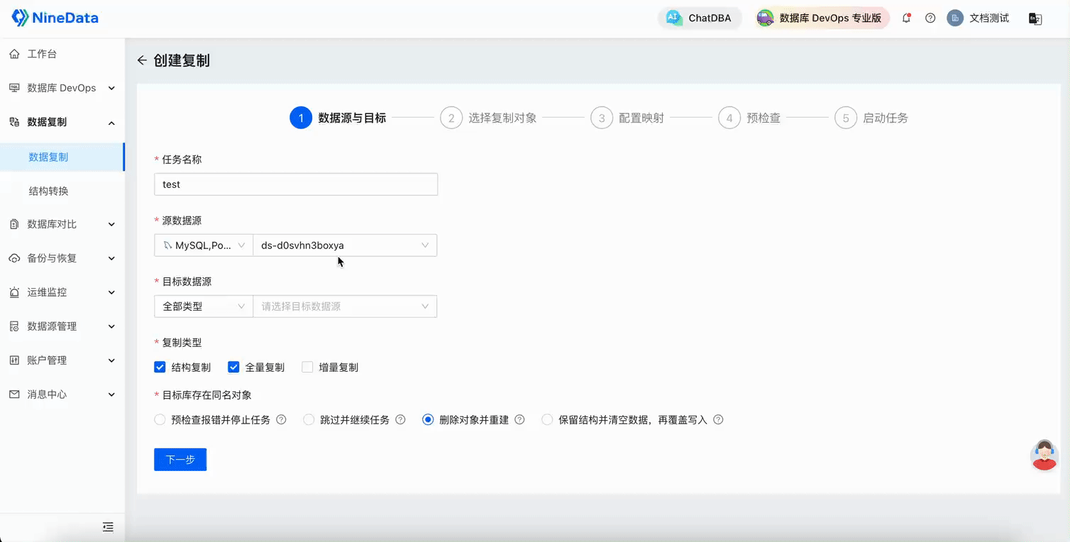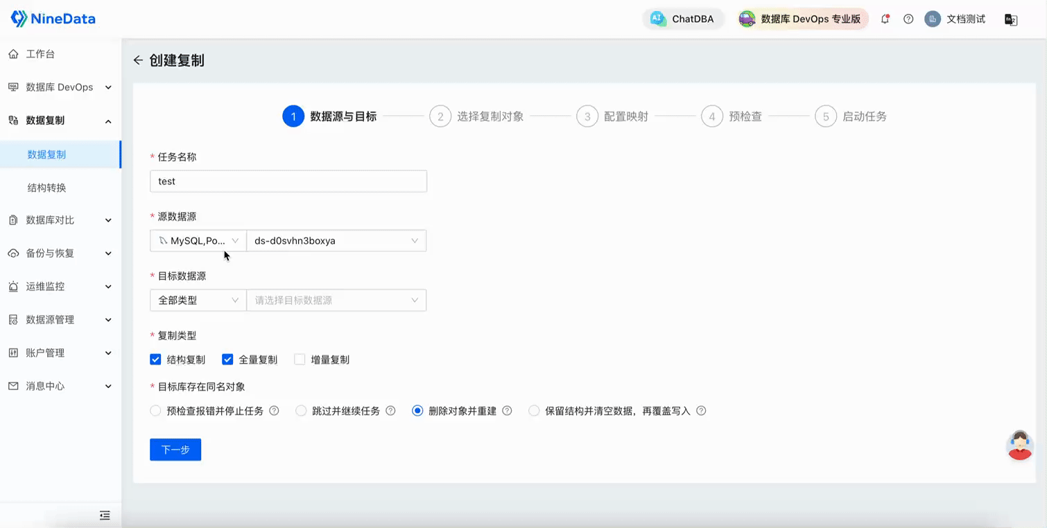 为了有效保护企业的核心数据,企业通常需要采取有效的备份和同步方案,将核心业务库的数据完整地复制到目标系统中。由于业务库一直在不断更新,企业需要基于设置的周期,让复制任务定期循环执行,例如每天、每小时甚至每十分钟一次,使目标系统中的数据保持最新。NineData 数据复制功能支持两个数据源之间的周期性全量复制,根据预先配置的周期自动将源端的数据全量复制到目标端。