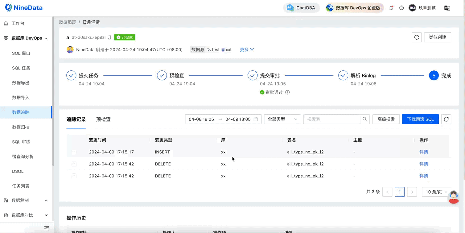 介绍:NineData 数据追踪功能用于解析数据库中对于数据或对象结构的变更或删除操作,并生成回滚语句,可用于数据的快速恢复。保证在误操作或数据错误之后,业务数据的完整性。