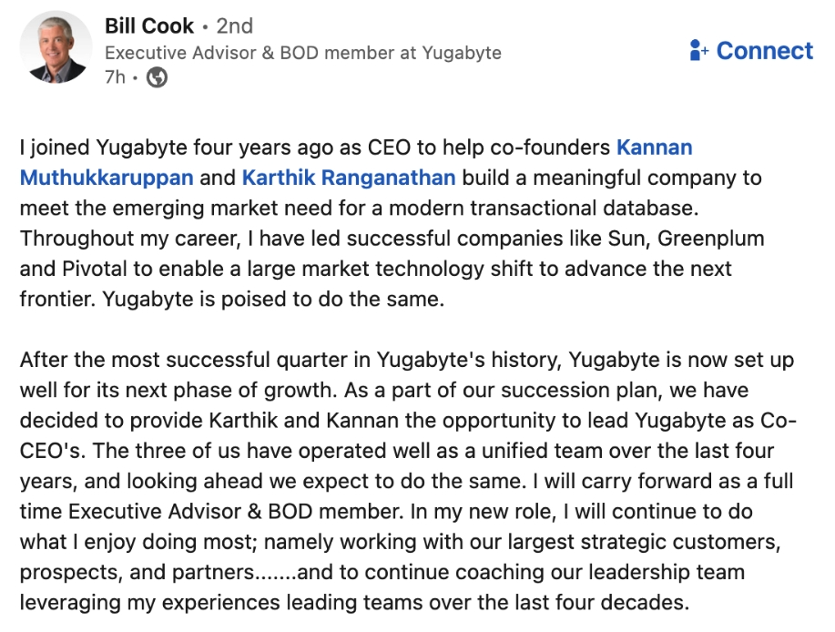 本周早些时候,Bill Cook突然宣布其将不再担任Yugabyte CEO一职,后续将由 Karthik和Kannan联合接替CEO一职。Bill Cook自2020年5月接任Yugabyte CEO一职以来已任职近四年,其在声明中称他不会退出Yugabyte,而是将以首席顾问(Executive Advisor)和董事会成员(BOD member)继续留在Yugabyte。