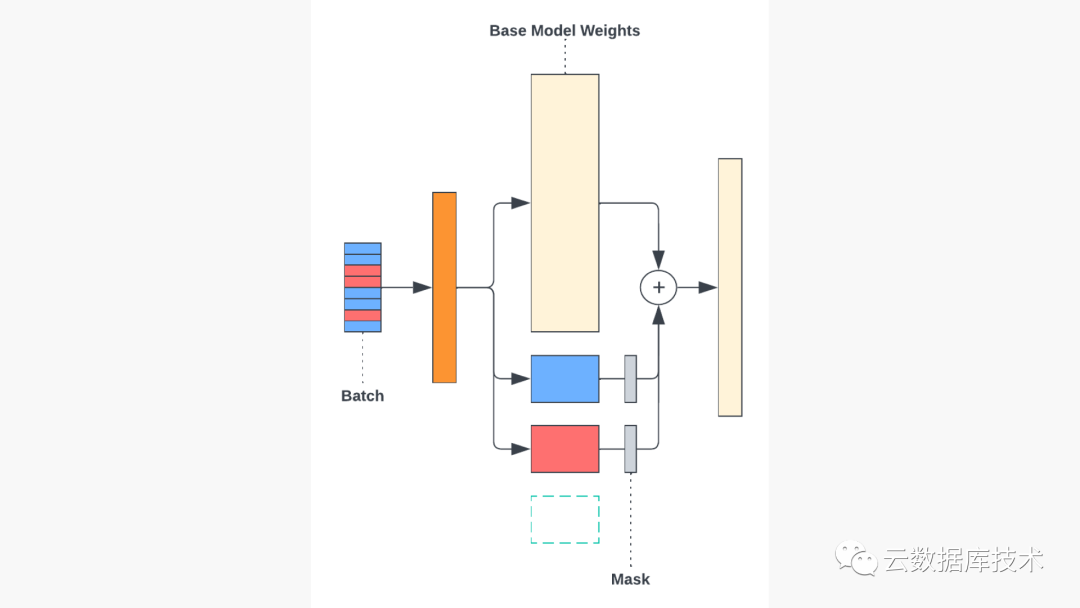 激活适配器的请求将从各自的队列中排出,并被连续分批处理。在计算每一层的激活时,一个简单的掩码可确保批次中的每个请求都应用了正确的适配器(见下图)。 -