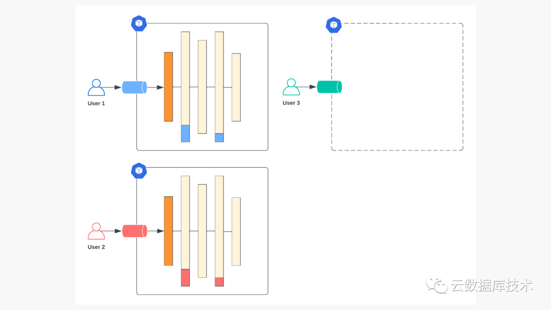 为多个微调模型提供服务的简单方法。用户 3 的模型(绿色)刚刚调配完毕,整个服务堆栈已全面部署。