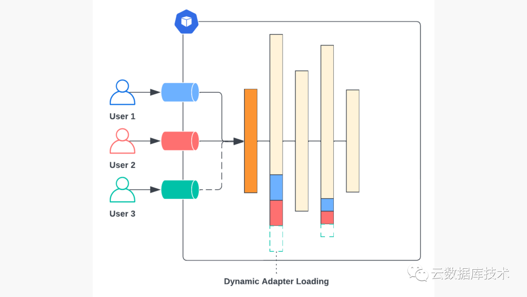 多个并发微调模型请求的动态适配器加载概览。用户 3 的模型(绿色)在后台加载,其他请求照常进行。