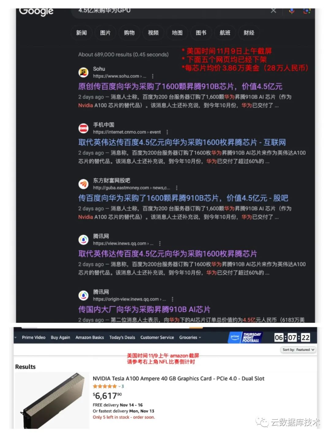 关于GPU的价格,请看亚马逊上的零售和最近百度的采购的新闻(该新闻已经下架)。直观感觉华为的芯片的批发价是英伟达零售价的6X(参考下图,本人对于GPU的理解非常肤浅,敬请拍砖指正)。尽管百度买的是服务器,但我们都知道服务器中芯片价值是主要的部分。另,A100官方报价为1万美金。