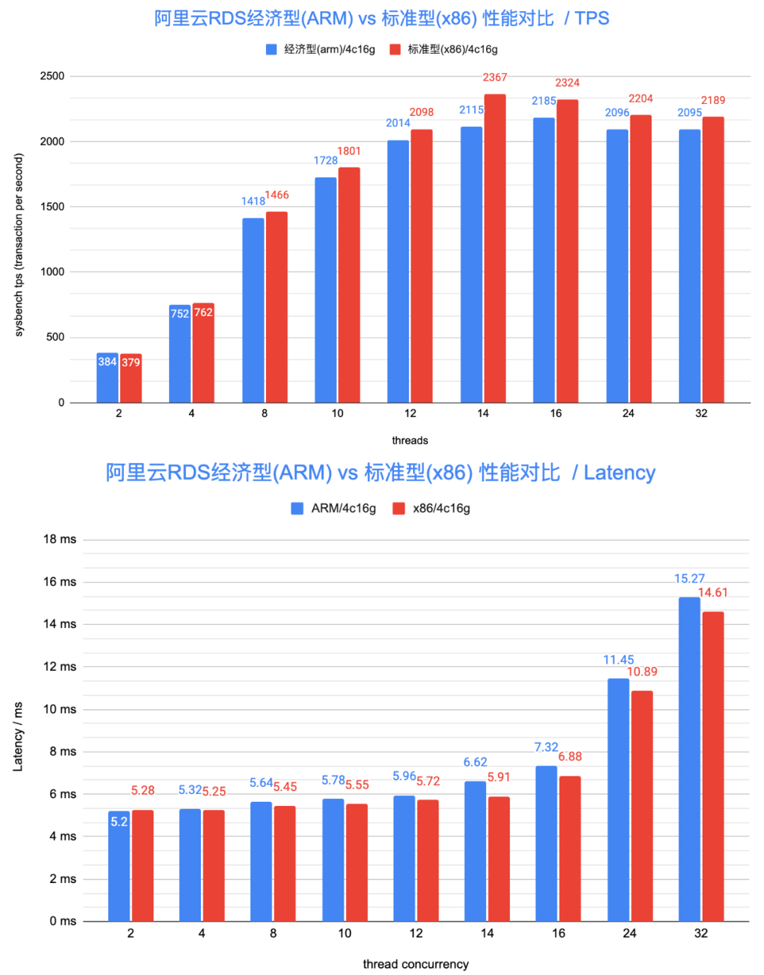 在如上的默认配置中,分别使用了2、4、8、10、12、14、16、24、32个并发线程进行测试。整体上,经济版(ARM)实例性能相比x86版要低约4%,延迟要高约4%。价格上,该规格经济版(ARM)相比标准版(x86)要低约36%,使用阿里云RDS经济版(ARM)性价比确实更高,相比标准版(x86)性价比要高出32%。