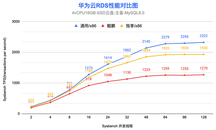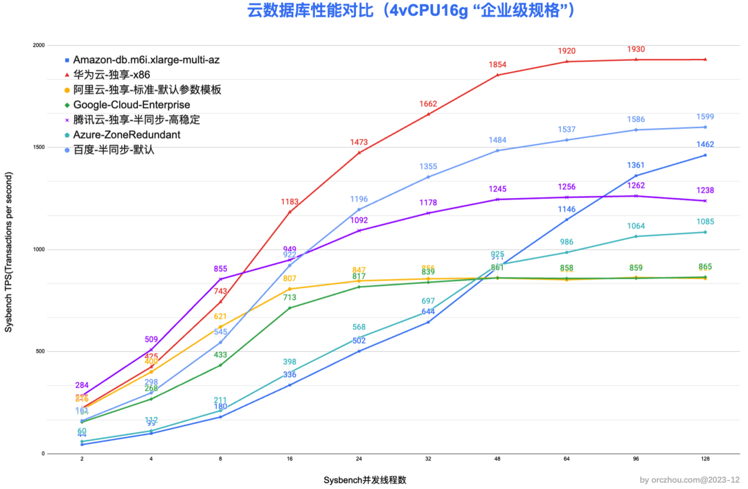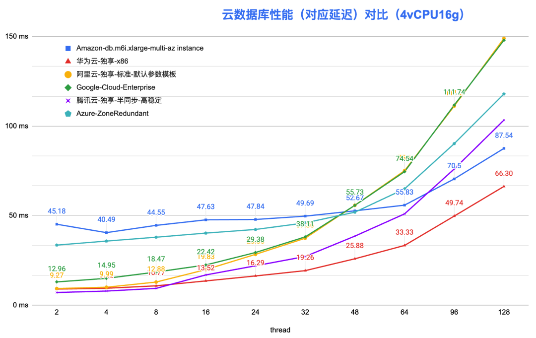 * 华为云数据库(红色),在中高并发度时(>=16),性能最强,且高于第二名约18%;