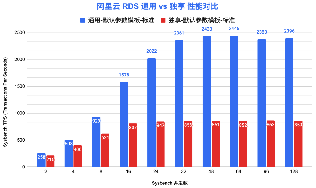整体上,通用规格,凭借其更多的CPU资源共享,整体表现出了更强劲的性能。一般的,通用规格性能比独享规格的性能的要高50%~150%。所以,当使用通用规格遇到了性能波动的问题的时候,如果升级到独享规格,则需要注意,即使是看似同样大小的规格的实例,性能可能会相差很多。这就是需要获得更稳定性能的代价,下图可以更加清晰的诠释这一点: