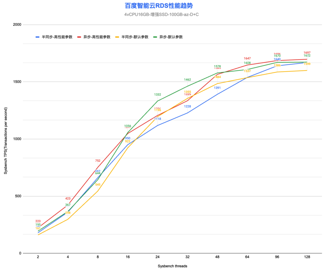 在前面的整体对比中看到,百度智能云RDS的“企业级规格”在中高并发时,表现出了非常强的性能,位居榜眼。百度云RDS的选项也比较简单,性能相关主要是“异步/半同步复制”、“高性能/默认参数模板”。其中,“异步/半同步复制”与阿里云、腾讯云等类似,这里不再赘述。