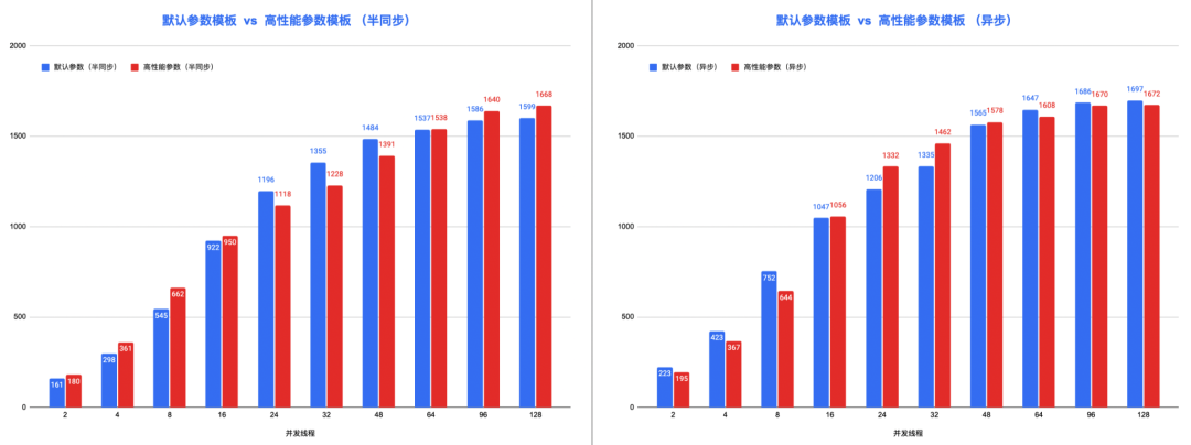 再来单独对比一下“默认参数模板”和“高性能参数模板”的性能情况。从如下两幅对比图中,则可以更加清晰的看到,无论是半同步还是异步模式下,这两类参数模板都并没有表现出太大的性能差别。