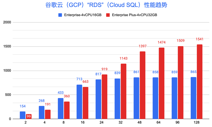 需要特别提到的是,Enterprise的测试使用的4vCPU16GB的规格,与其他云的测试规格是一致的。但,因为“Enterprise Plus”没有该规格的,于是使用了最为接近的4vCPU32GB规格替代。因为这里的测试,主要瓶颈在于CPU和IO,内存增加的对于性能的影响是有限的。