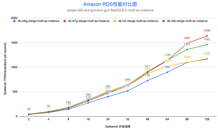 Amazon RDS提供了m6i(第三代Intel Xeon/Ice Lake实例)、m5(Xeon® Platinum 8175M or 8259CL)、Graviton 2(即m6g)、Graviton 3(即m7g)这四种架构选择,在性能上也有着较为直接的对应关系。