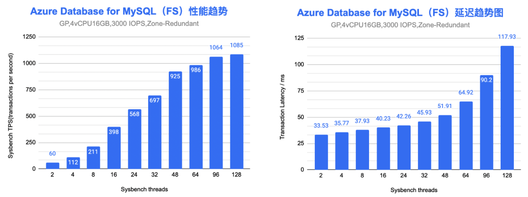 Azure云上购买托管MySQL的选项(与数据库有关的)应该是比较简单的。主要的选型包括,是否需要可用区容灾、IOPS类型选择、Intel还是AMD平台。在本次测试中,选择了US East地区,选择了跨可用区的容灾(Zone redundant),使用预留的IOPS,预留值为3000,使用的Intel的CPU,实例规格为4vCPU16GB内存。规格代码为D4ds_v4。详细的测试性能趋势图如下:
