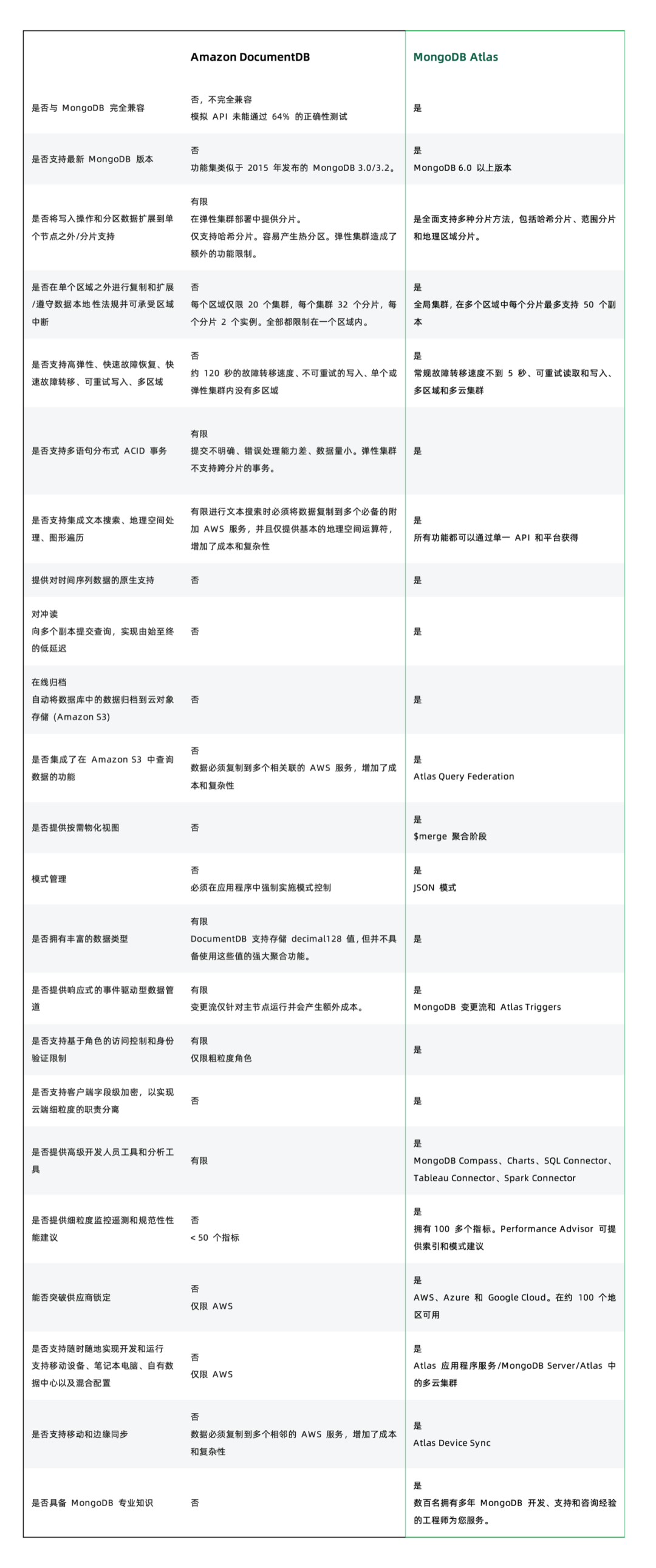 MongoDB现在主推是自家的Atlas云服务,并且给出了DocumentDB与Atlas的差异,他们认为DocumentDB只是和MongoDB3.0/3.2版本兼容度很好,对MongoDB4.0后的特性兼容度很差。最后一条也挺有意思,MongoDB认为DocumentDB的团队对MongoDB的专业知识不足。