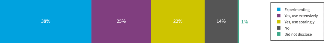 今年,我们询问受访者是否正在使用任何公共云提供商的GenAI服务。四分之一的受访者表示他们已经广泛使用它,38%的人正在尝试,22%的人很少使用它。
