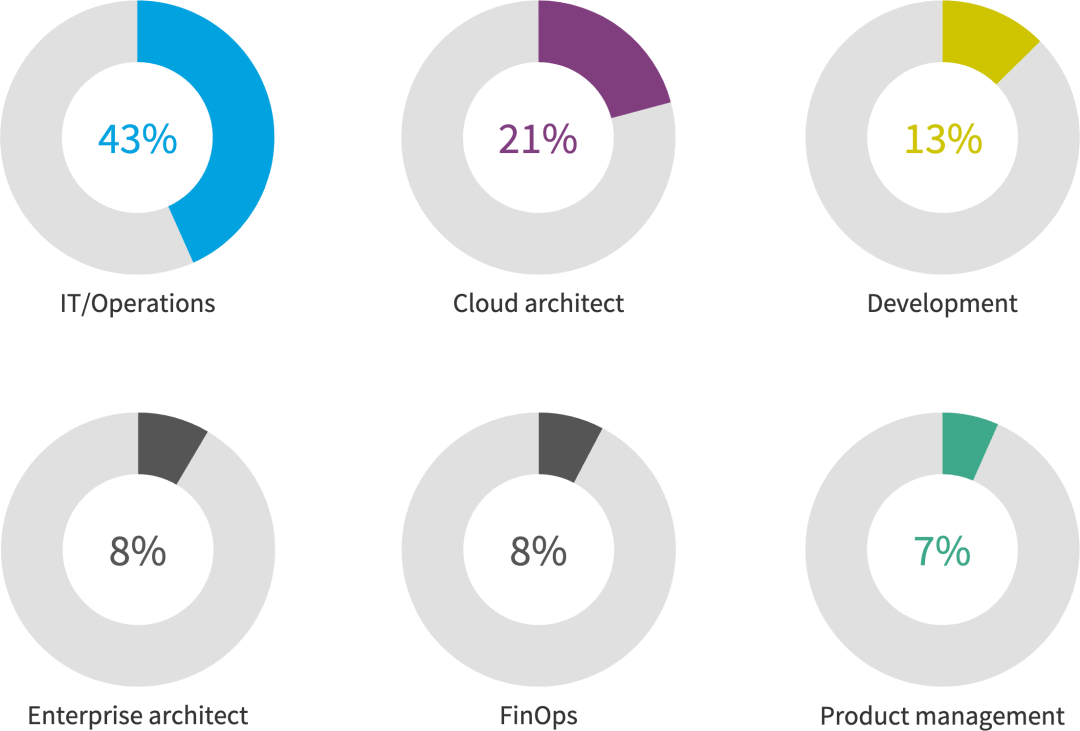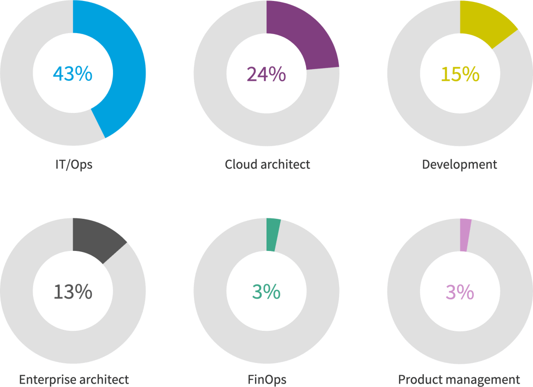 下图显示了按业务角色和他们在组织内工作的位置划分的受访者的细分。21% 的受访者是云架构师,8% 的受访者表示担任FinOps角色。表示他们在云中心团队(CCOE或类似团队)工作的受访者大幅增加,从去年的35%增加到今年的50%。