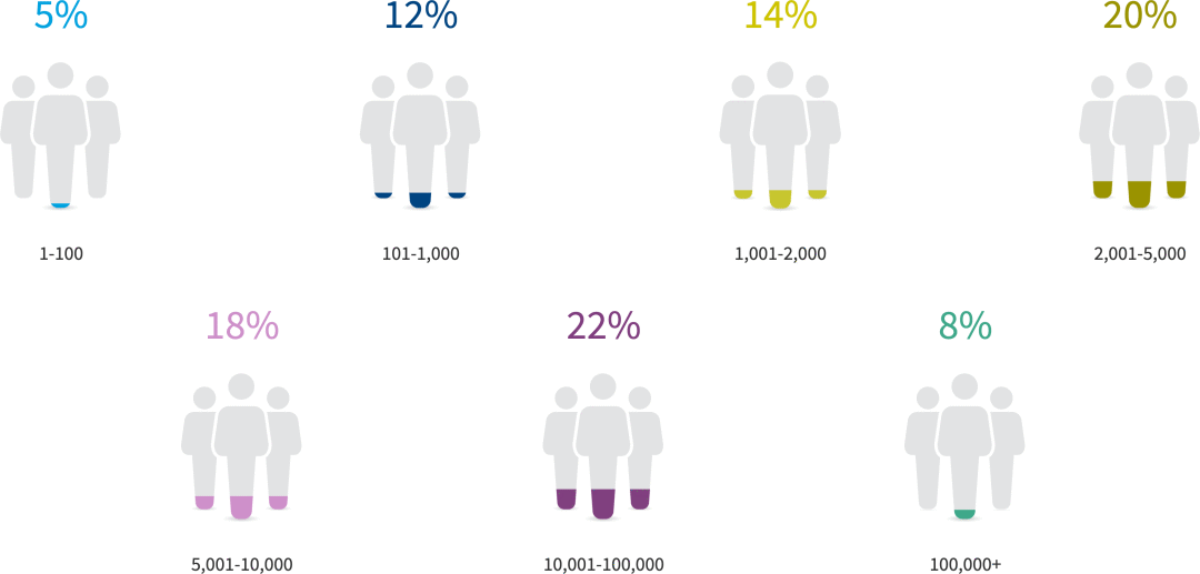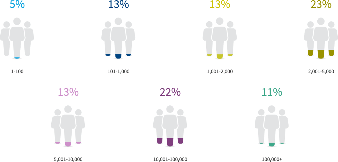 今年的调查倾向于企业,68%的受访者在员工人数超过2000人的组织中。8%的公司拥有超过100,000名员工。