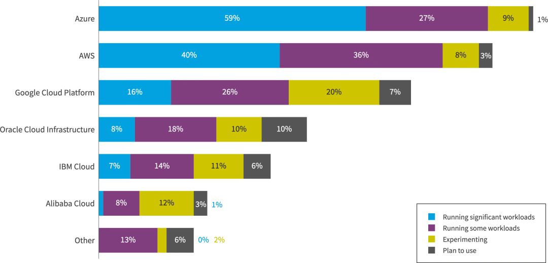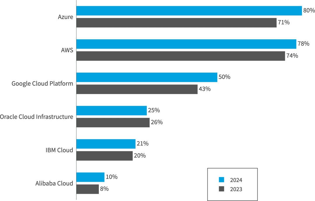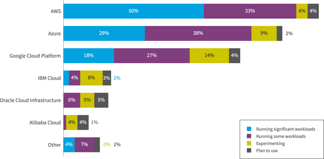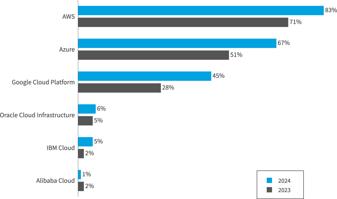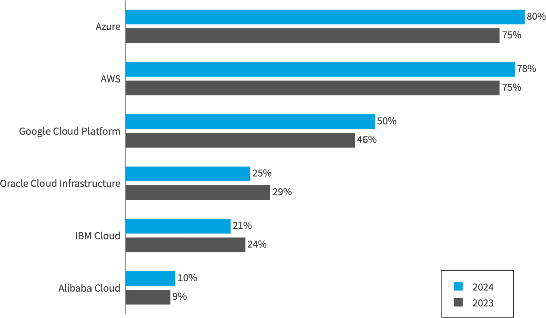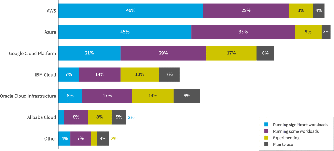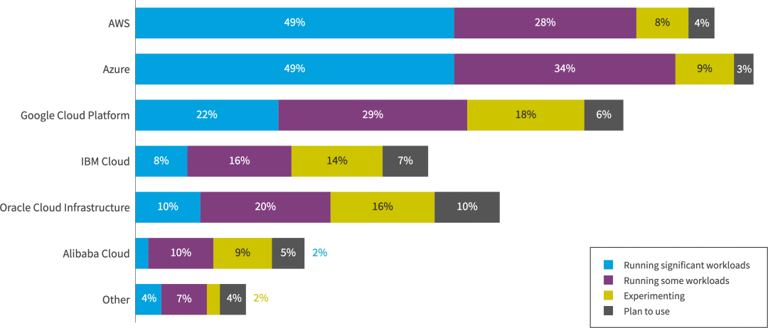 亚马逊网络服务(AWS)和Microsoft Azure仍然是使用最广泛的云平台。具体来说,49% 的受访者表示使用 AWS 处理大量工作负载,而 45% 的受访者表示使用 Azure,21% 的受访者表示使用 Google Cloud Platform。相比之下,Oracle Cloud Infrastructure、IBM和阿里云的使用量与上一年相比保持相对不变。