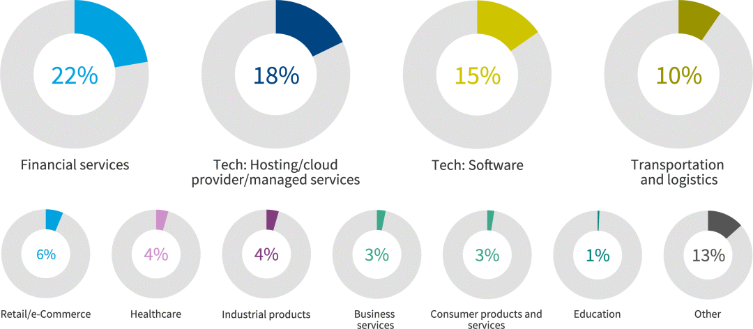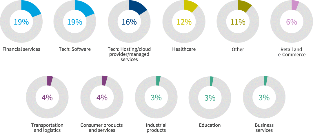 科技相关行业(软件、托管/云提供商/托管服务之间占35%)和金融服务(19%)是受访者的行业,其次是医疗保健(12%)。