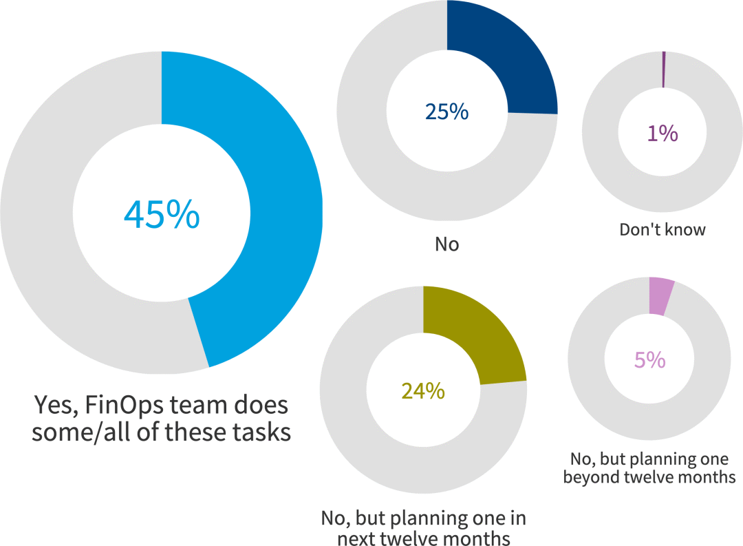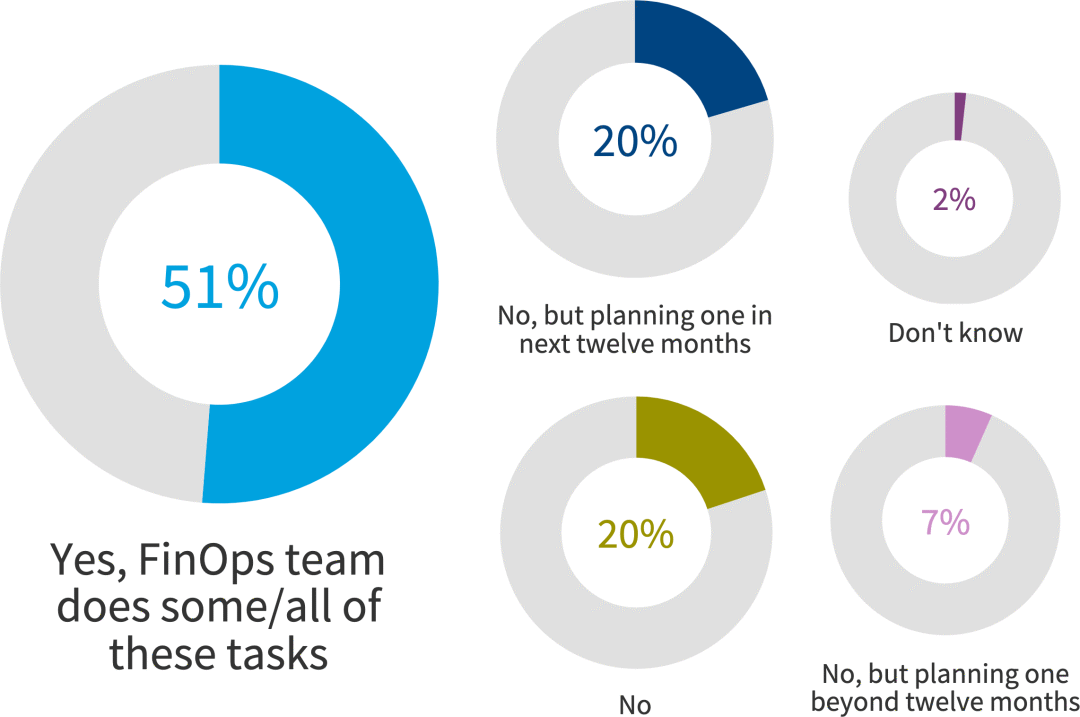 一半的组织 (51%) 拥有 FinOps 团队,20% 的组织计划在来年创建一个团队。