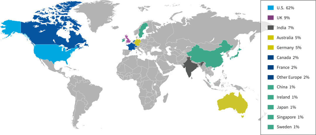 与去年类似,近三分之二的受访者来自美洲(62%来自美国)。来自欧洲的受访者占总数的20%,英国占该群体的9%。