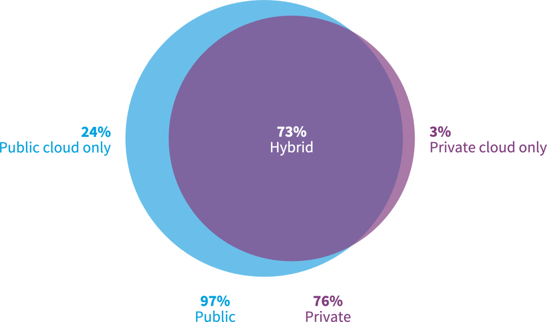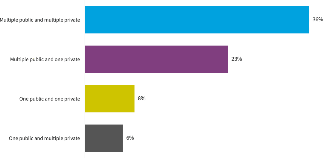 越来越多的受访者使用多个公有云和一个私有云(同比从19%上升到23%)