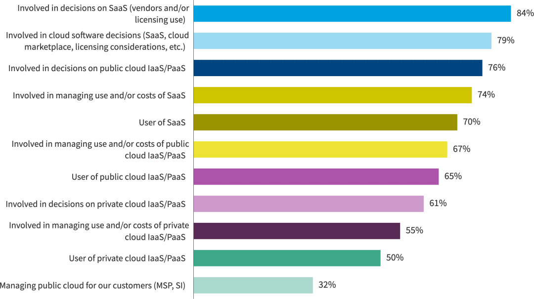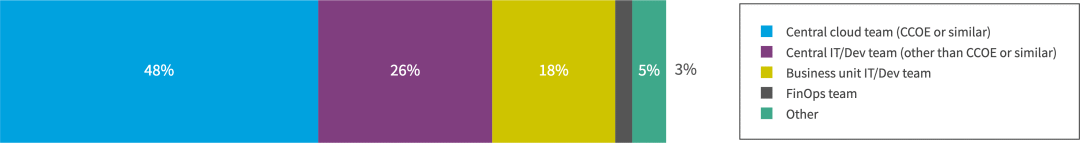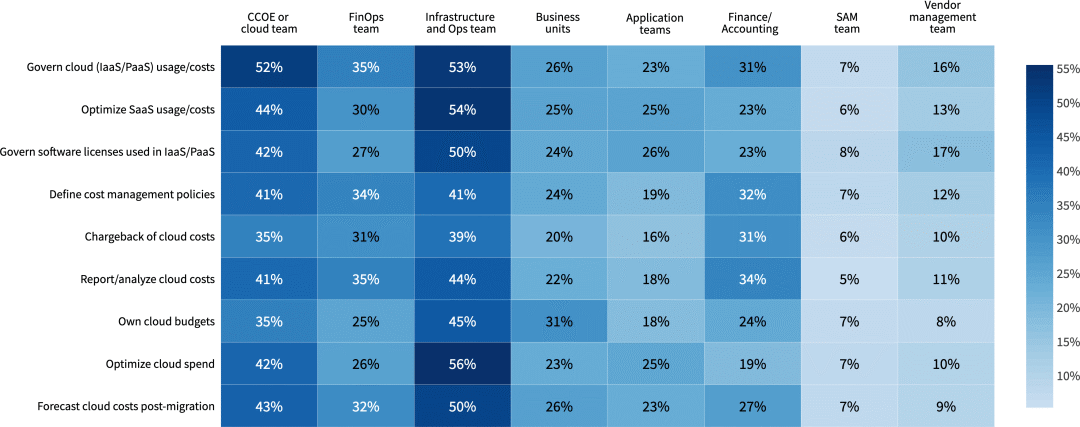 像往常一样,基础架构和运营部门以及 CCOE 或云团队负责云成本管理。基础架构和运营团队最有可能管理云 (IaaS/PaaS) 的使用/成本 (53%)、优化 SaaS 使用/成本 (54%) 以及管理 IaaS/PaaS 中的软件许可证 (50%)。