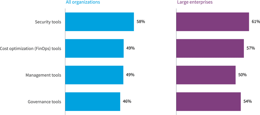 今年,安全工具仍然是所有组织的首位,紧随其后的是成本优化 (FinOps) 工具和管理工具。使用安全工具(61%)和FinOps工具(57%)的大型企业比例更高。
