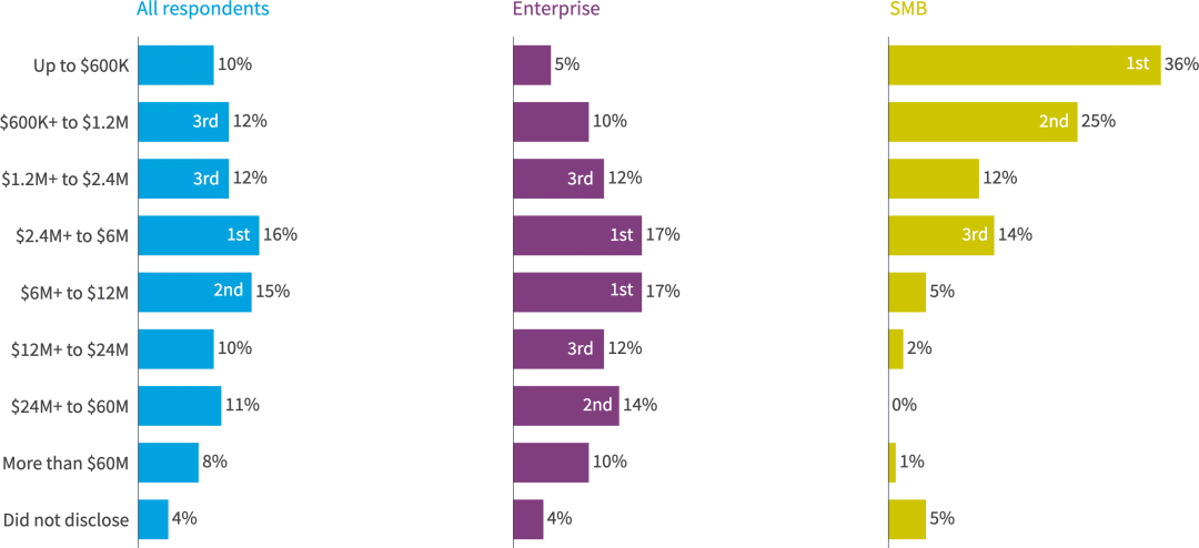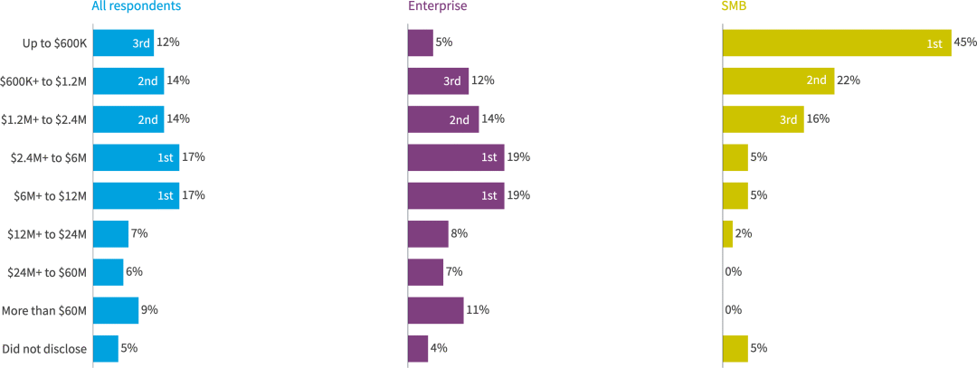 近四分之一的受访者(22%)目前每年在SaaS上的支出超过1200万美元。对于企业来说,这一比例增加到26%。