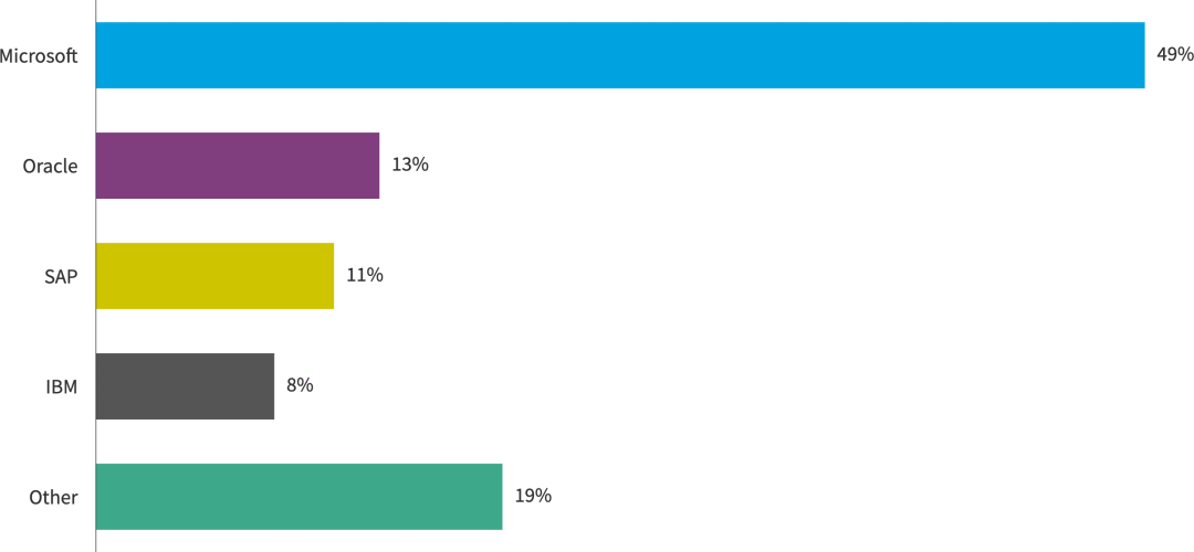 Flexera 首次按供应商询问受访者的非 SaaS(云和本地)软件成本。Microsoft是迄今为止最常见的非SaaS软件供应商(49%)。