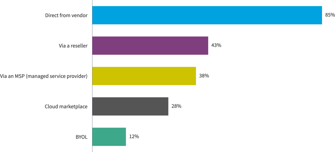 此外,绝大多数非SaaS软件购买是直接从供应商处购买的(85%),主要供应商是Microsoft。这些采购很可能是根据现有的企业协议 (EA) 进行的。