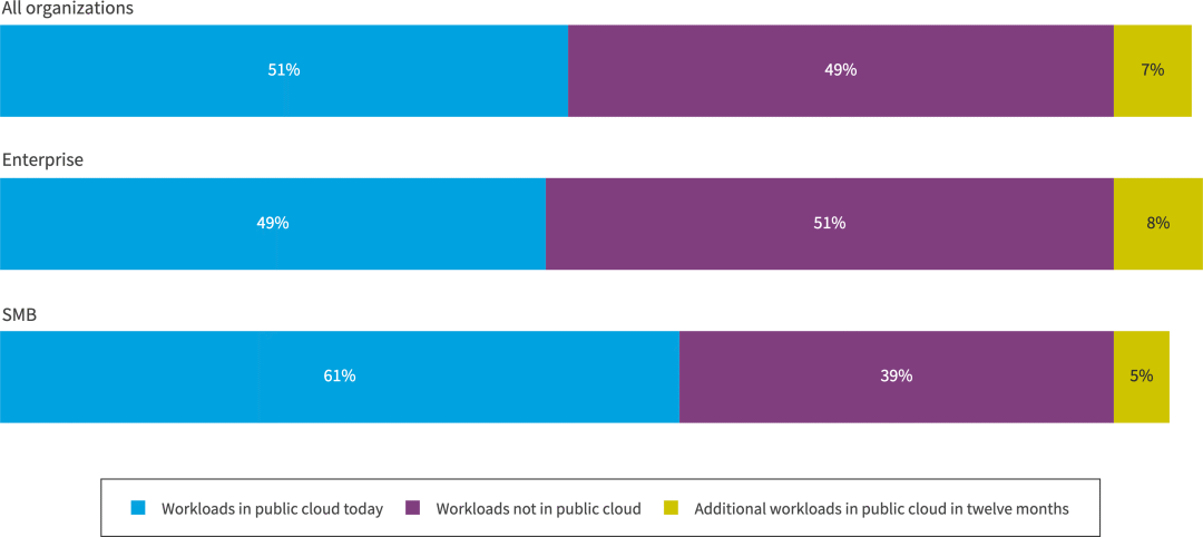 中小型企业是云采用率最高的企业,但比上一年略有下降,这两年有61%的工作负载和60%的数据在公共云中。