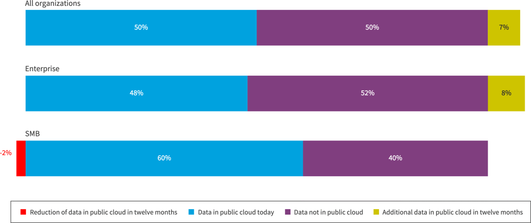 对于所有受访者来说,目前有 51% 的工作负载在公共云中,预计在未来 12 个月内还会有 7% 的工作负载。目前,一半的组织在公共云中拥有数据,预计在未来 12 个月内还会有 7% 的数据。企业拥有更复杂的环境,但使用率略低,49% 的工作负载在公有云中,48% 的数据在公有云中。