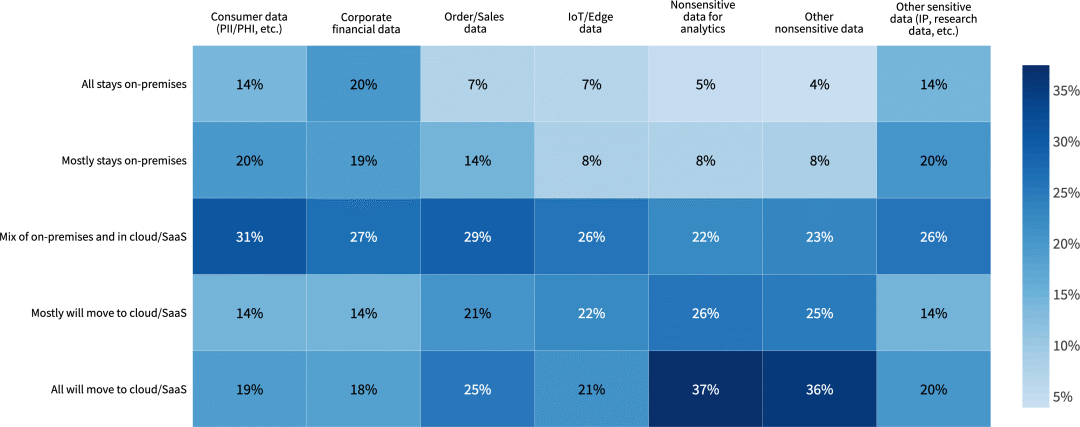 超过三分之一的受访者表示,所有非敏感数据都将转移到云端,近五分之一的受访者表示,他们将把所有敏感数据转移到云端