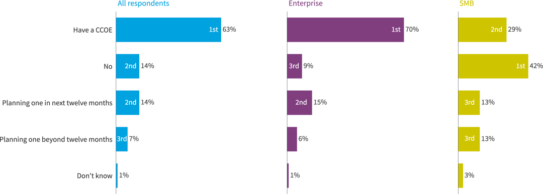 大多数组织 (63%) 拥有 CCOE 或计划在明年创建一个 CCOE (14%)。70% 的大型企业已经拥有 CCOE,而只有 29% 的中小企业拥有 CCOE。15%的企业预计在未来12个月内增加一个CCOE,6%的企业预计在此之后增加一个CCOE。超过四分之一(26%)的中小企业计划在未来建立CCOE。