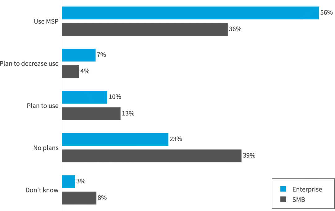 56%的企业至少将一些公共云工作外包。MSP 的 SMB 使用率从 26% 的同比增长率增加到 36%。