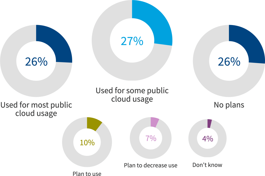 53%的组织至少将一些公共云工作外包,其中26%的组织使用托管服务提供商(MSP)进行大多数公共云使用。