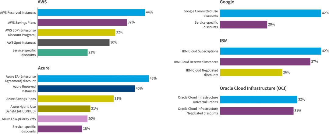 云提供商的定价结构复杂且难以解读,但提供商折扣提供了降低成本的机会。大多数受访者使用 Azure EA(企业协议)折扣 (45%)、AWS 预留实例 (44%)、Azure 预留实例 (40%)、IBM Cloud Subscriptons (42%)、Google 承诺使用折扣 (42%) 或 Azure 预留实例 (40%)。