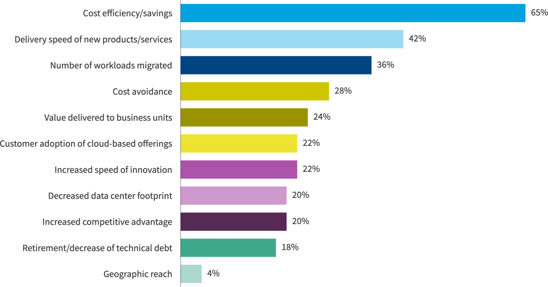 在过去六年中,衡量云进展的首要指标是成本效率/节省。今年,这一比例从60%增加到65%。迁移到云的工作负载数量也从 31% 同比增长到 36%。