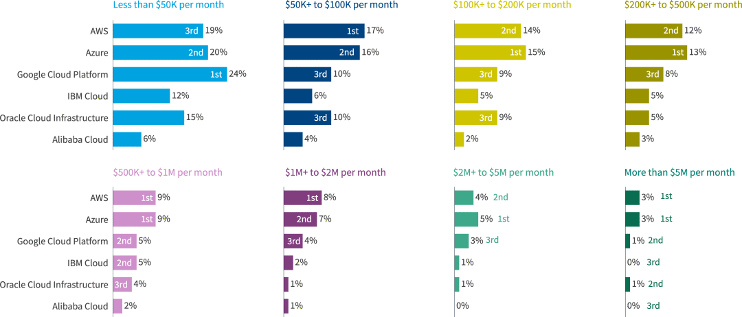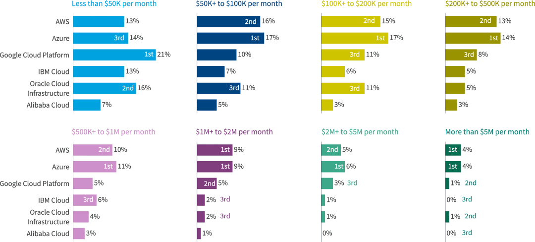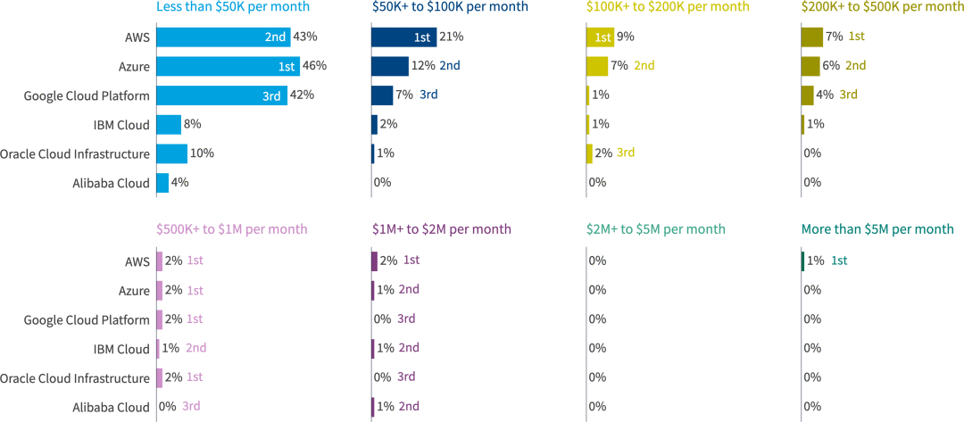 在所有受访者中,AWS和Azure在所有支出级别上几乎持平。