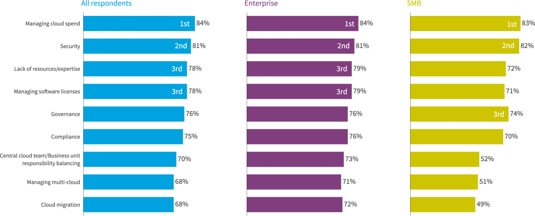 连续第二年,管理云支出是所有组织面临的最大挑战。这种转变可能是由于组织对云安全越来越满意,而云服务使用的增加导致支出增加。管理这笔支出已成为组织的首要任务。与之前的《云现状》调查结果一样,缺乏资源和专业知识仍然是一个重大挑战。