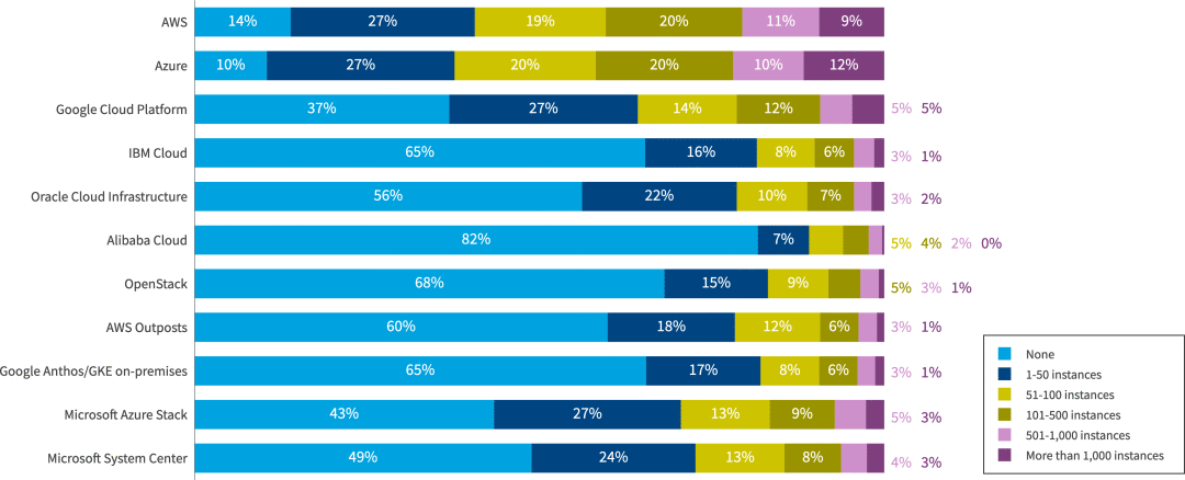 每个云中运行的虚拟机(vm)或实例的数量可以进一步了解其中的组织占用空间的大小。AWS和Azure在超过500个实例的较大占用空间中处于领先地位。在私有云/本地部署领域,微软的产品(如Microsoft Azure Stack和Microsoft System Center)比AWS Outposts或Google Anthos拥有更大的部署空间。