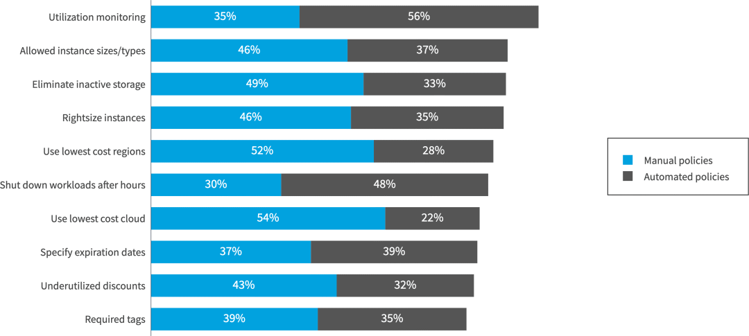 利用率监控 (56%) 和下班后关闭工作负载的自动化策略 (48%) 是优化云成本的最常见方法。大约三分之一的受访者 (35%) 已经制定了自动化策略来标记云资源,这是 FinOps 实践的基本组成部分。