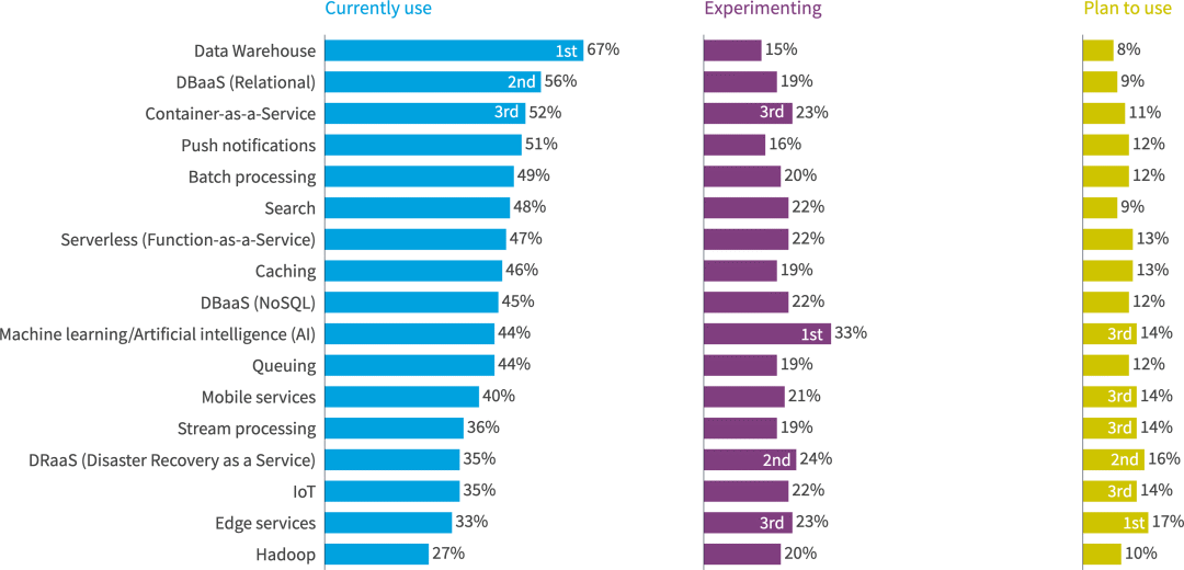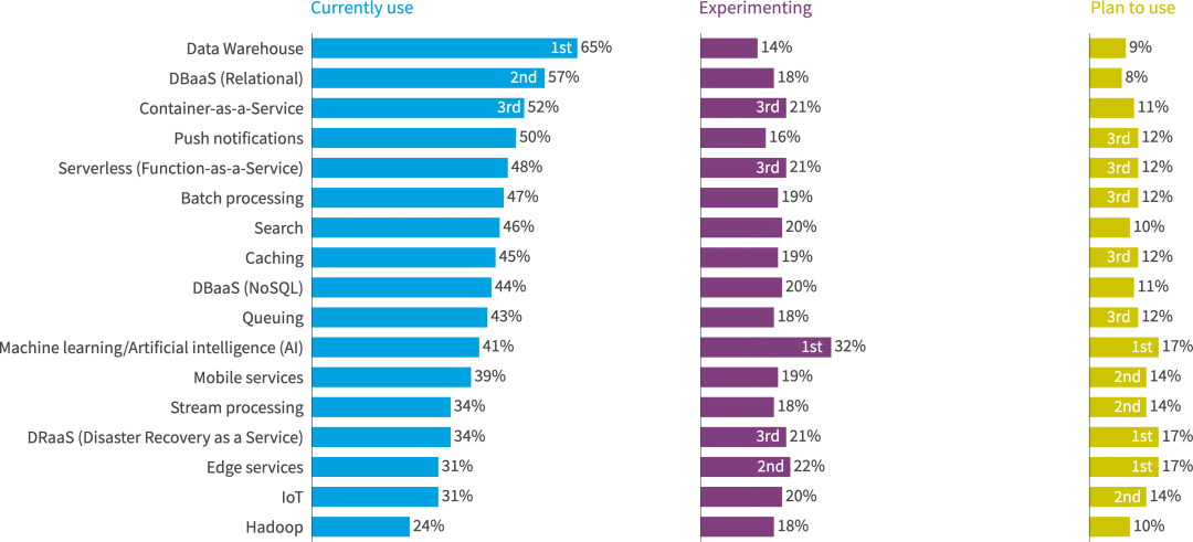 在今年的调查中,几乎所有的 PaaS 产品的使用量都有所增加,其中最大的是数据仓库(从 56% 的同比增长上升到 65%)。容器即服务(52%)和无服务器(功能即服务)(48%)今年都增长了9个百分点。机器学习/人工智能(AI)的增幅从去年的36%小幅上升至41%。