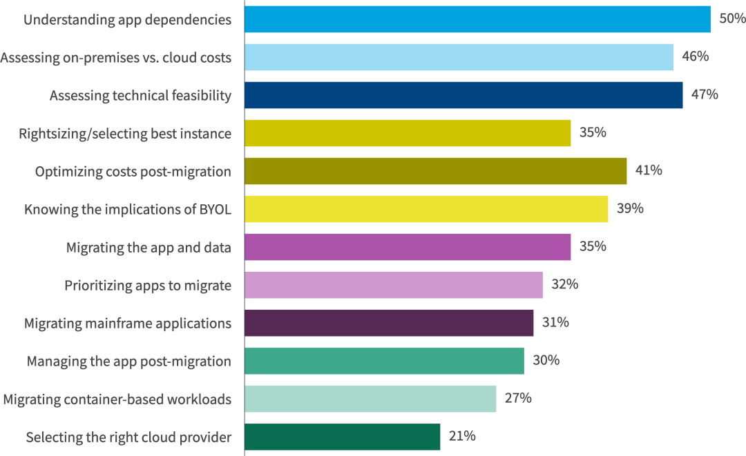 众所周知,为每个 IT 交付的服务映射应用程序、硬件和网络设备之间的所有关系是非常困难的。超过一半的受访者表示,了解应用依赖关系 (54%)、评估本地成本与云成本 (46%) 以及评估技术可行性 (45%) 是云迁移面临的三大挑战。