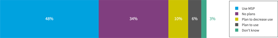 欧洲受访者不太可能(48% 对全球 53%)使用 MSP 来管理至少部分云使用情况。他们也不太可能(6%对全球10%)计划在未来使用MSP。